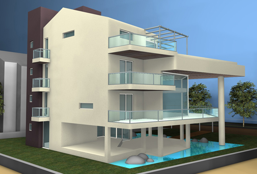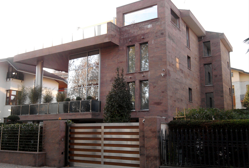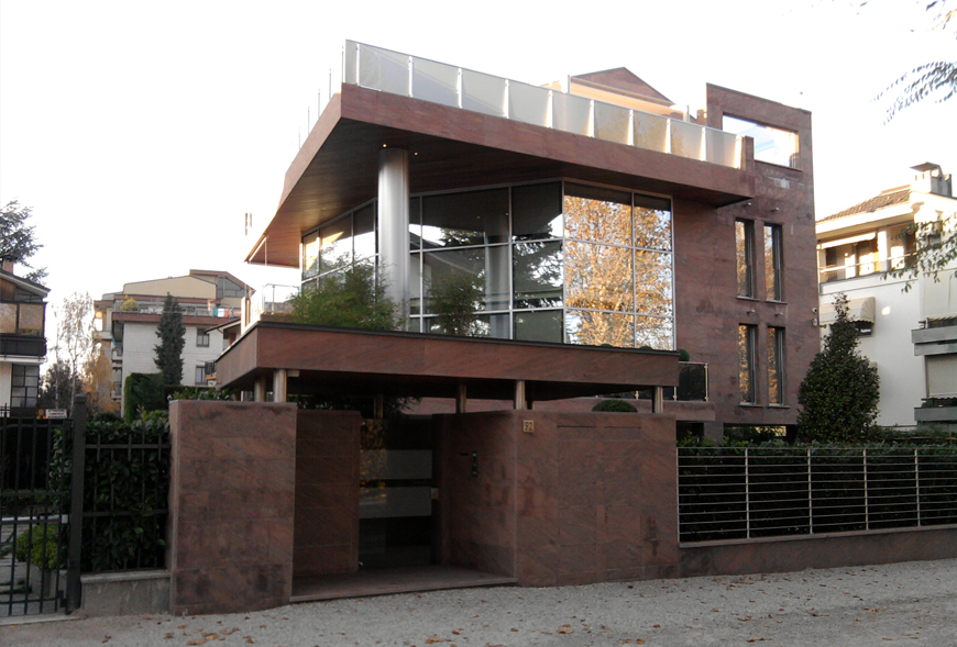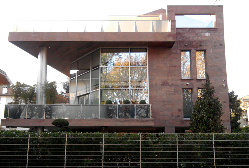 Situata a Cuneo, questa villa è stata pensata per rispondere alle esigenze del committente che richiedeva un progetto funzionale e innovativo ma con uno stile sobrio e contemporaneo, che ben si adattasse al sito in cui andava a posizionarsi, il prestigioso Viale degli Angeli. Intergrazione, evidenziando la sua nuova costruzione. I materiali utilizzati, sono ricercati e lo studio delle fasce esterne fanno risaltare la linearità del disegno. L'utilizzo dell'acciaio ad alternanze lucide e satinate, dei vetri specchianti e trasparenti movimentano il prospetto lasciando al rosso granito la predominanza dell'impatto visivo. L'interno è arioso e suggestivo, il primo piano a doppia altezza e le grandi vetrate a specchio imprimono una sensazione di apertutra verso l'esterno senza togliere la privacy alla famiglia.